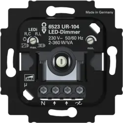 Busch-Jaeger Dreh-/Druckdimmer mit geringer Einbautiefe für LED-Lampen 2 bis 100 W (Phasenan- und Phasenabschnitt manuell einstellbar). Für Glüh- und Halogenlampen last von 10 bis 360 W. Auch für elektronische und gewickelte Transformatoren geeignet.